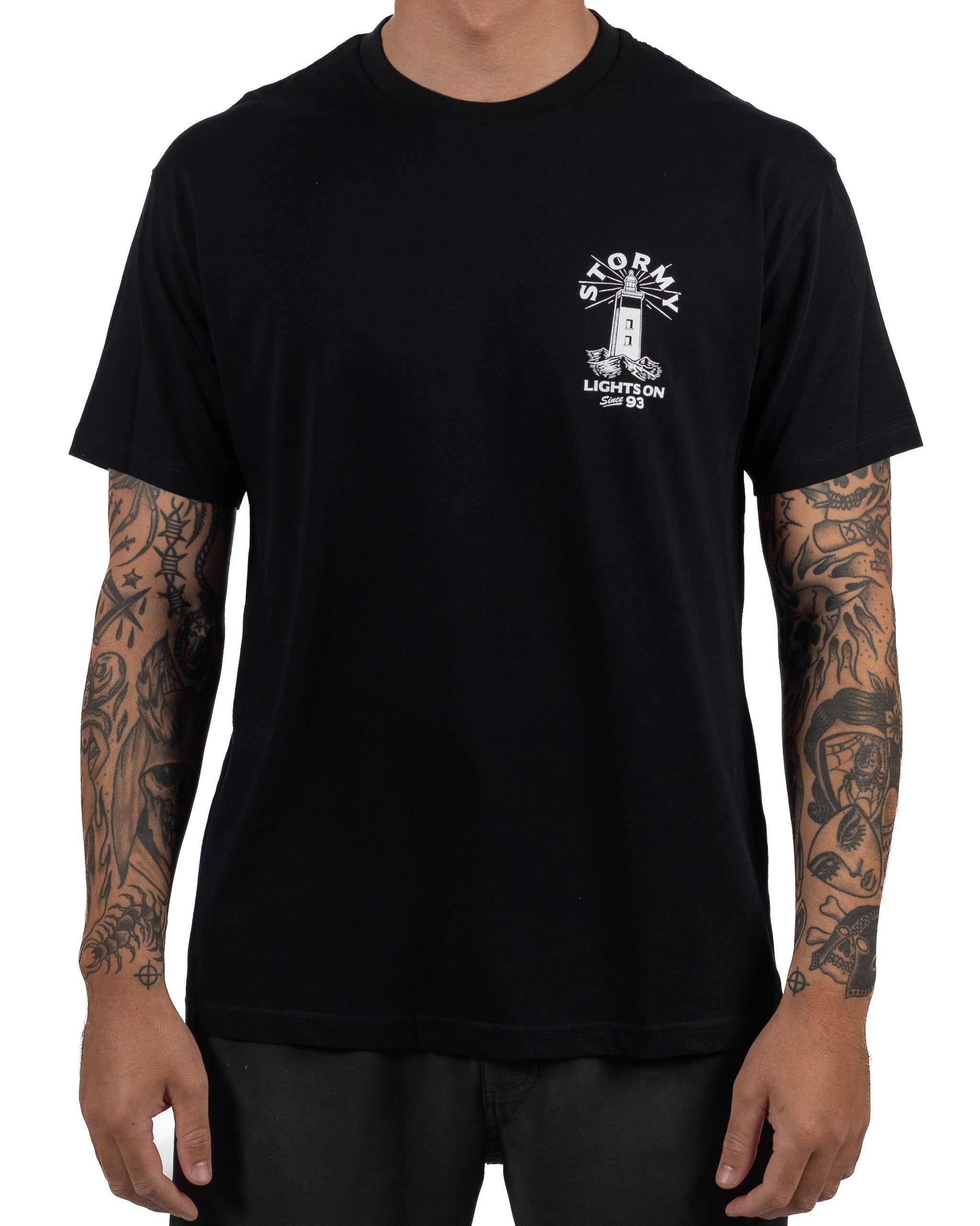 Embrace coastal vibes with the Stormy93 Lights On T-Shirt in black. Designed for adventure enthusiasts and style seekers, this premium tee showcases a striking lighthouse illustration, embodying the rugged charm of the sea. Boldly printed with the words “Stormy Lights On,” it celebrates Stormy’s legacy of crafting high-quality gear since 1993. Made from soft, durable fabric, this t-shirt ensures all-day comfort and lasting appeal, perfect for casual outings or seaside adventures. Ideal for those who crave the coastal spirit and exceptional quality.